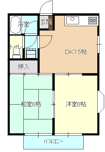 間取り2DK(ダイニングキッチン・7.5帖・洋室 6帖・和室 6畳)