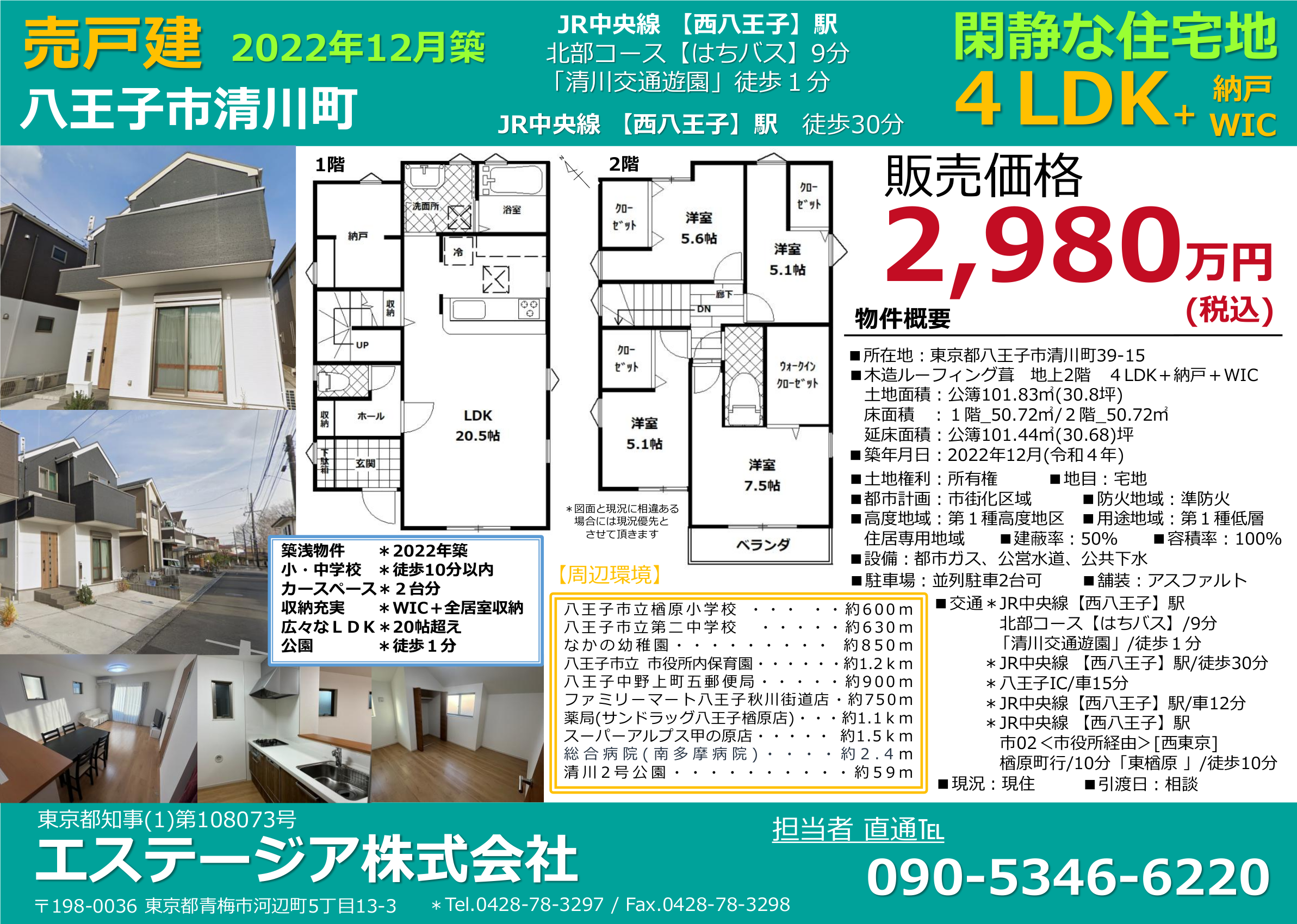 4LDK/販売価格2,980万円/JR中央線「西八王子」駅より はちバス北部コース乗車9分「清川交通遊園」バス停 徒歩1分、JR中央線「西八王子駅」徒歩30分