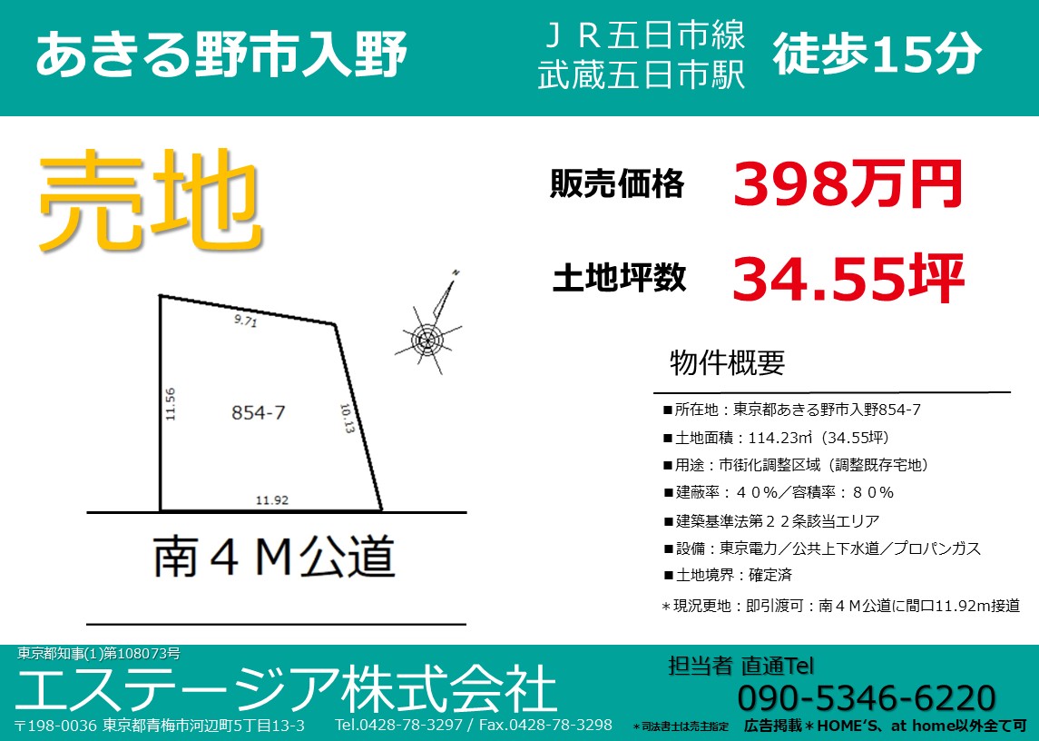 土地坪数34.55坪/販売価格398万円/JR五日市線 武蔵五日市駅 徒歩15分